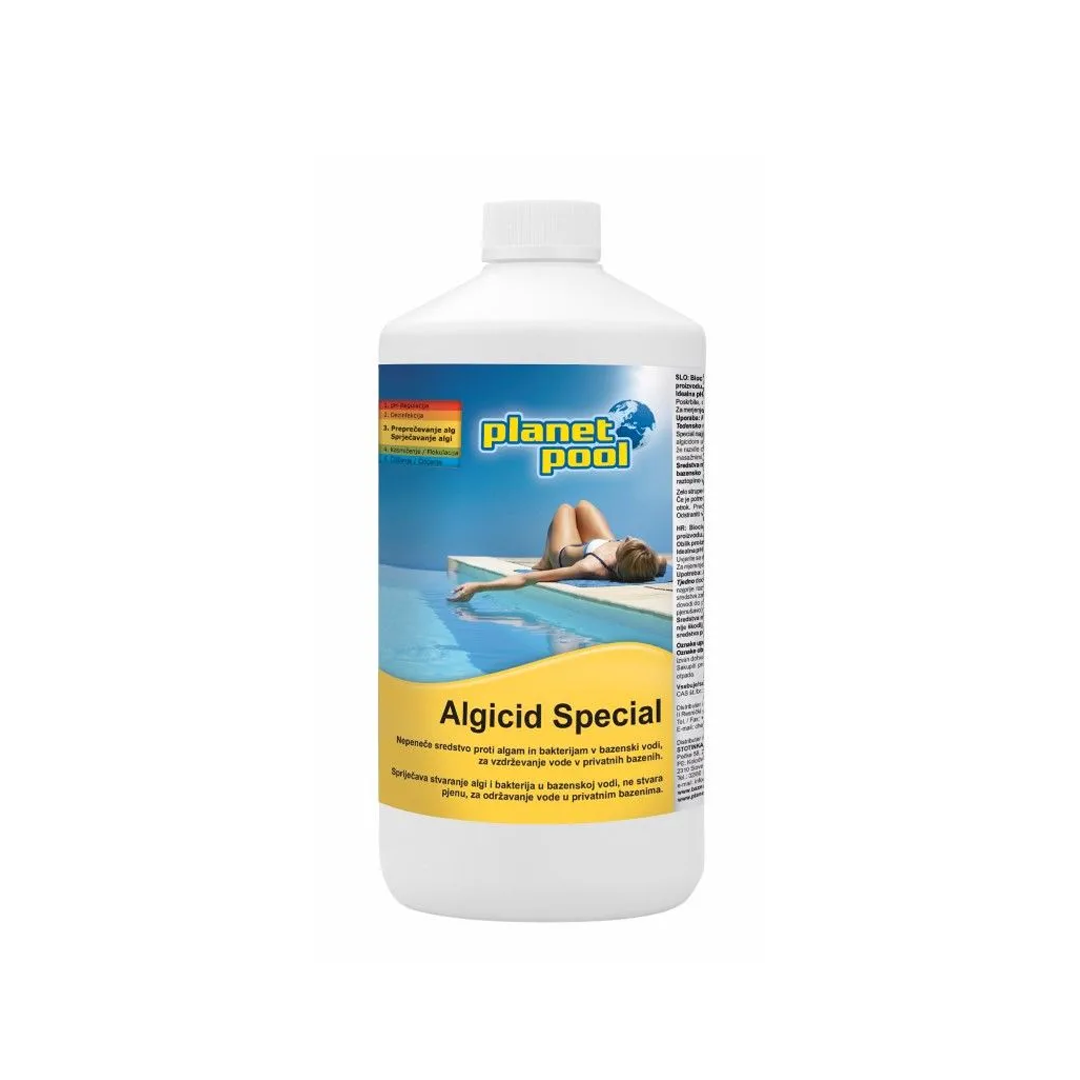 Algicid special je popolnoma nepeneče sredstvo za zatiranje alg in bakterij v bazenski vodi. Posebej primeren je za bazene z masažami ali protitočnimi napravami. Idealna pH-vrednost je 7,0 – 7,6. Idealna vsebnost klora je 1 – 3 mg/L. Poskrbite, da bosta vsebnost klora in pH vrednost vedno v idealnem območju. Za merjenje uporabljajte merilec za pH in merilec za klor.