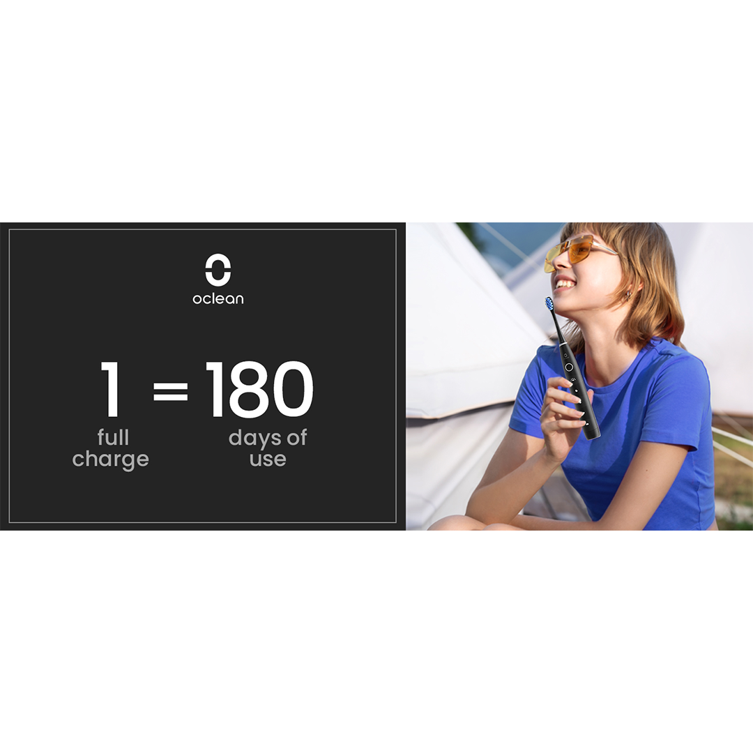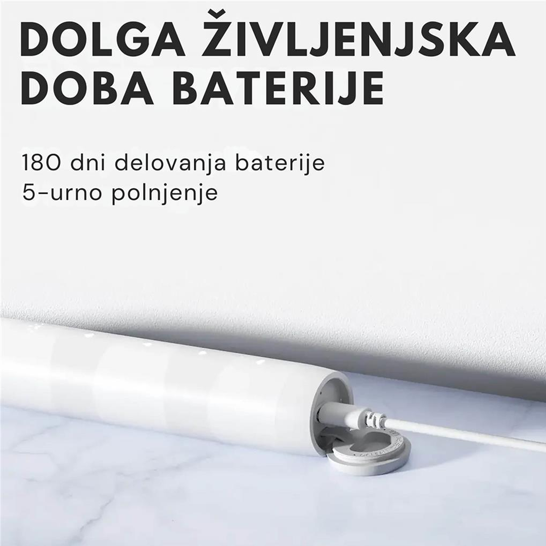 • Do 180 dni delovanja baterije: Brezskrbna uporaba in dolgotrajna nega zob. Po popolni napolnitvi baterija zdrži do 180 dni – brez nadležnega tedenskega ali mesečnega polnjenja.