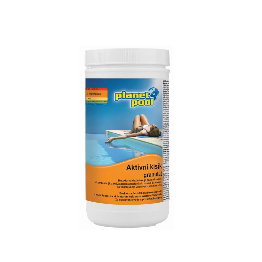 Aktivni kisik granulat se uporablja za brezklorno dezinfekcijo bazenske vode. Deluje skupaj z aktivatorjem za aktivni kisik. V kombinaciji z aktivatorjem zagotavlja kristalno čisto vodo. Primeren je za vzdrževanje vode v privatnih bazenih.