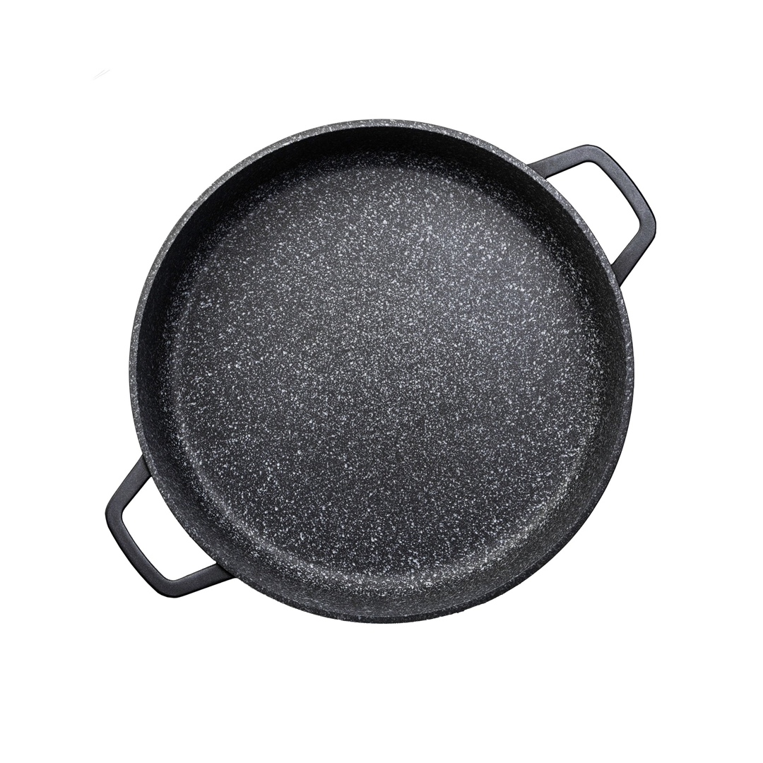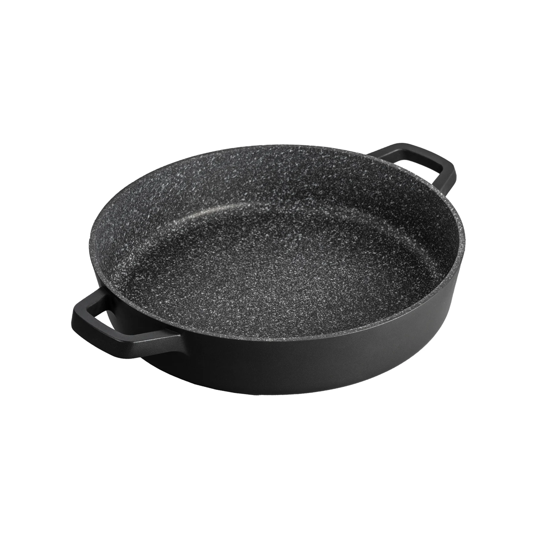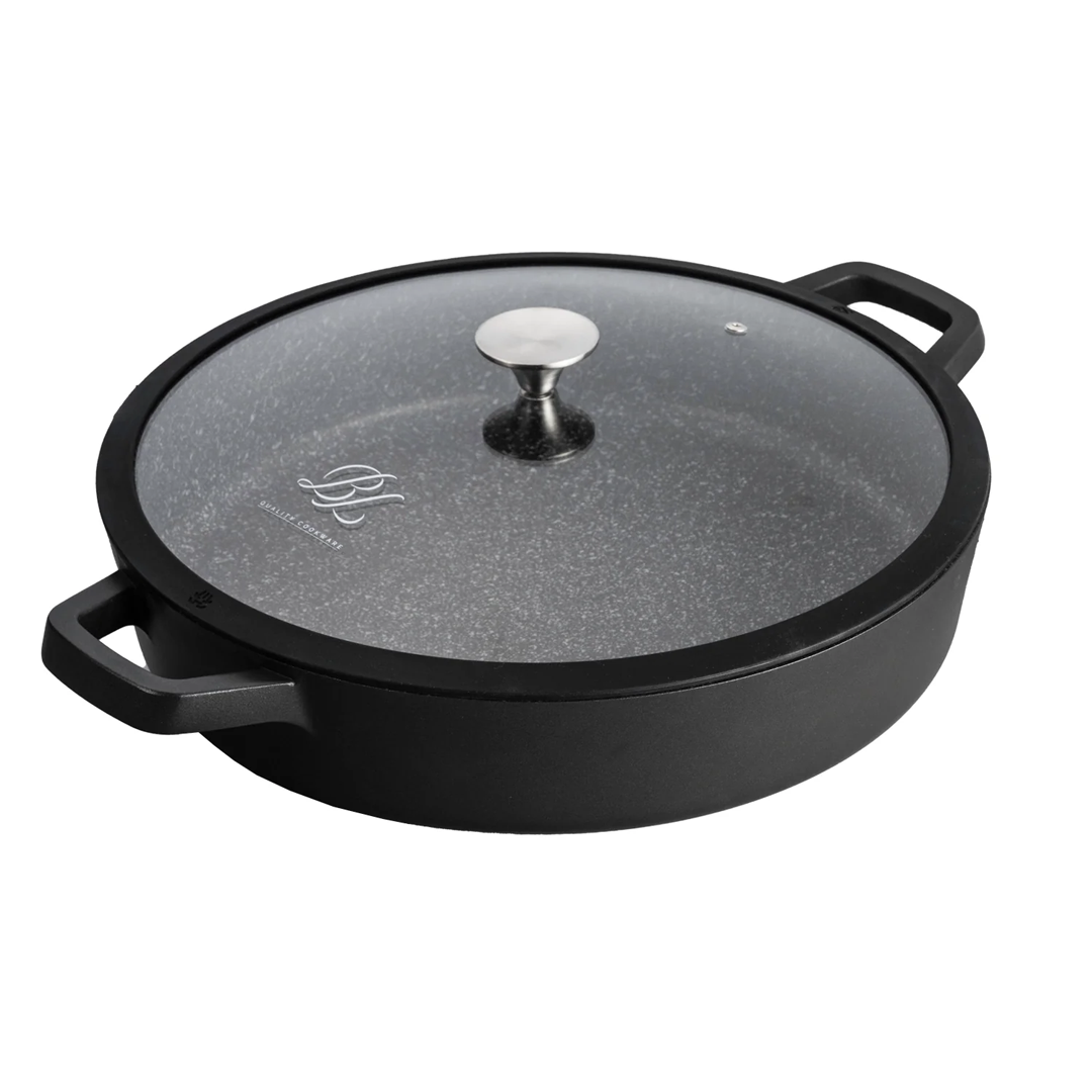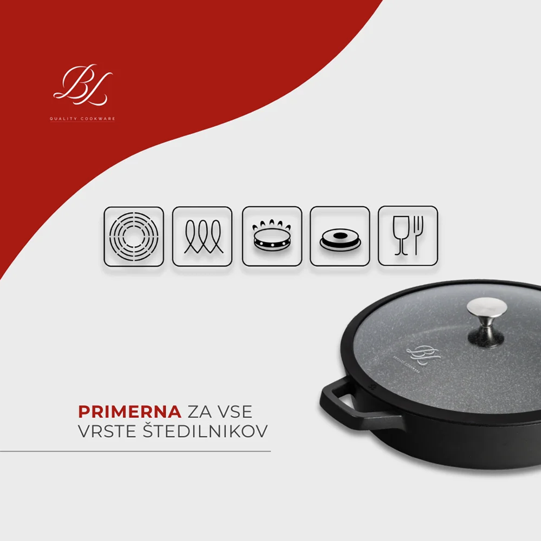 Kvalitetna nizka kozica premera 36 cm s pokrovko iz kaljenega stekla, idealna za pripravo večjih obrokov in nepogrešljiva v vaši kuhinji.