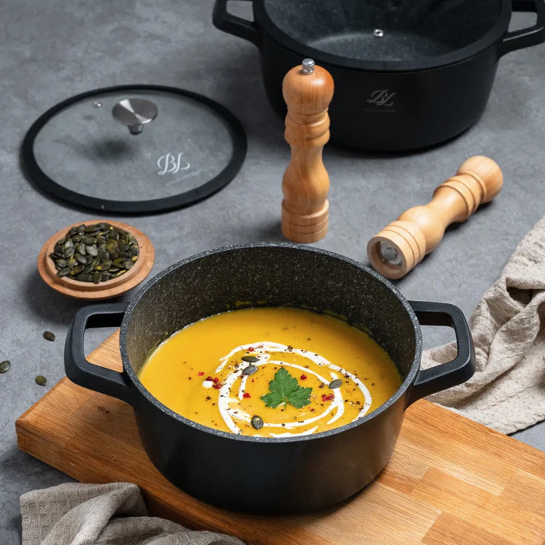 • premaz GREBLON C3 GRANITE: s keramičnimi delci ojačan trislojni nemški premaz, ki omogoča pripravo jedi z manj maščobe in brez sprijemanja hrane na površino posode