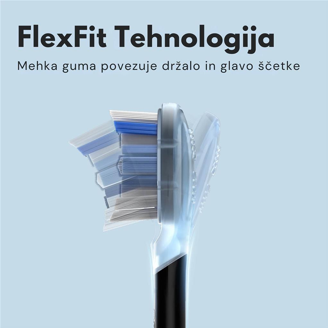 • FlexFit Tech: Mehka gumijasta povezava med nosilcem in glavo ščetke zagotavlja optimalno čiščenje medzobnih prostorov z najboljšim prileganjem gibanja, hkrati pa nudi odlično zaščito zob s pomočjo gume, ki absorbira udarce.