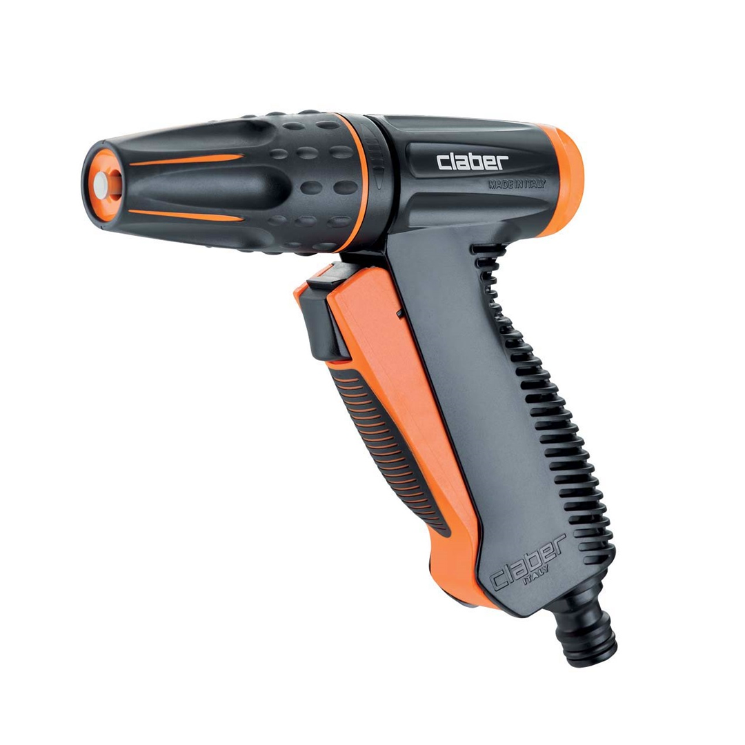 Razpršilna pištola z novim anatomsko oblikovanim gumijastim ročajem in priročnim gumbom za vklop/izklop sprednji strani. Gumb na zadnji strani prilagaja moč vodnega curka. Glava pištole je obložena z gumo, ki jo ščiti pred udarci. Pretok vode se lahko prilagaja zahtevam, od popolnoma zaprtega (koncentriran curek) do popolnoma odprtega (pršenje).