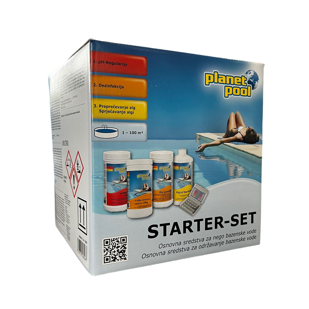 Starter set je komplet sredstev za popolno nego bazenske vode, vsebuje: 1 kg klor granulata, 1 kg velikih klorovih tablet, 1,5 kg pH minus granulata, 1 l Algicida Standard in pool testerja za pH/klor.