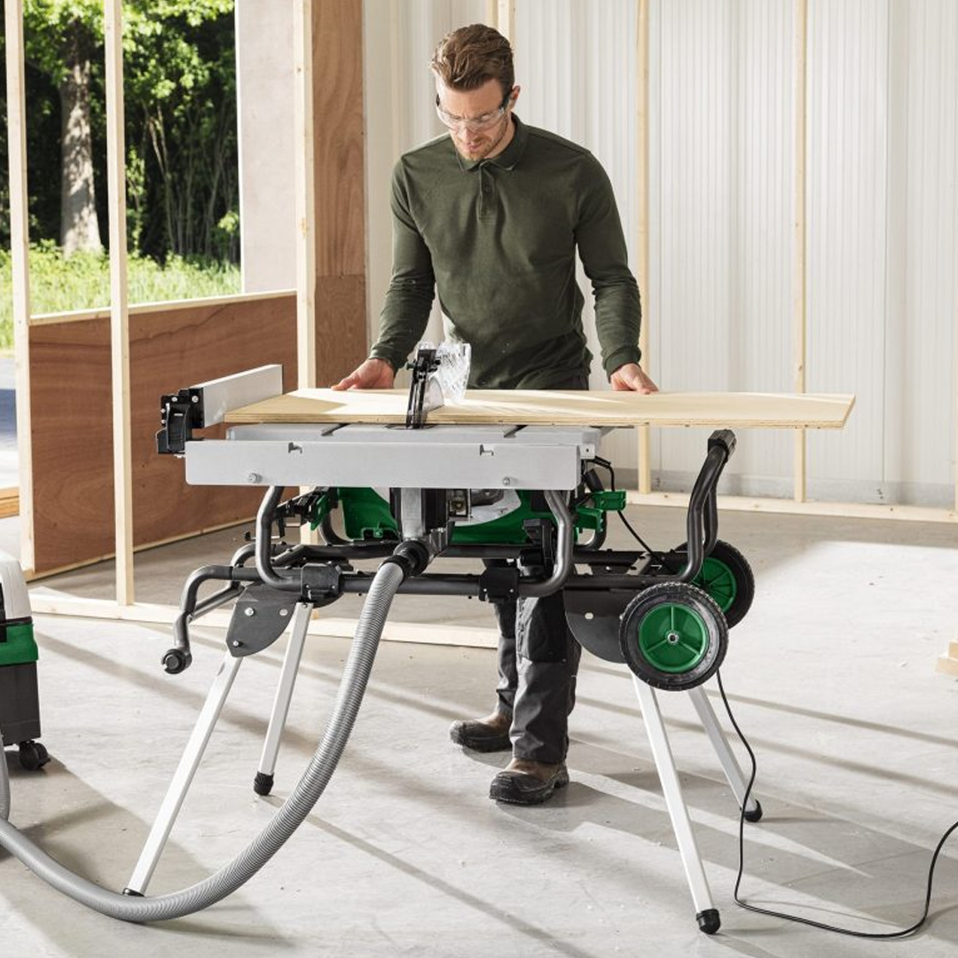 Mizna krožna žaga Hikoki C10RJ se odlikuje s stabilnim in robustnim dizajnom. Žaga je na stojalu s kolesi in ima čvrsto mizo iz tlačno litega aluminija z robustnimi nogami za enostavno postavitev in stabilnost med uporabo. Z možnostjo podaljška mize se lahko brez težav žaga tudi zelo dolge obdelovance. Opremljena je tudi z varnostnim zaklopom. Zaradi kompaktne in ergonomske izdelave je postavljena ali zložena v trenutku. Žaga je odlična izbira tako za profesionalno rabo kakor tudi za domače mojstre.